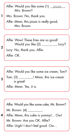 Alfie: Would you like some pizza, Mrs. Brown? (Cô có muốn một chút bánh pizza không ạ, cô Brown?)
