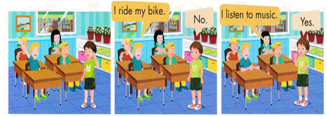 Cách chơi:  Một bạn sẽ diễn tả 1 hành đông. Các bạn sẽ đoán bạn đó đang làm gì, ví dụ “I ride my bike.” (Tôi đi xe đạp.),hoặcI listen to music.” (Tôi nghe nhạc.). Nếu đúng thì nói “Yes”, sai thì nói “No”.