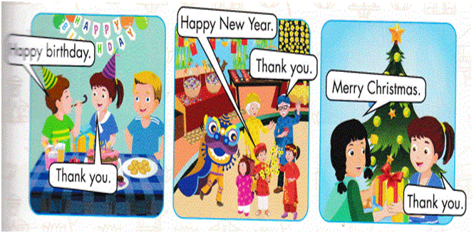 Cách chơi: Các bạn sẽ đóng vai và thực hành với nhau, ví dụ 1 bạn nói “Happy birthday” hoặc “ Happy New Year”, hoặc “ Merry Christmas”, bạn còn lại sẽ nói cám ơn “Thank you”.