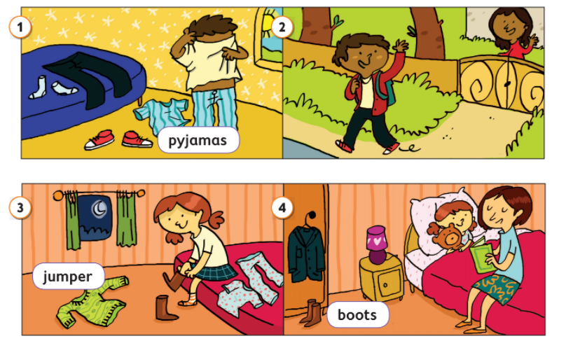 Put on your T-shirt. Put on your trousers.