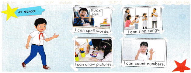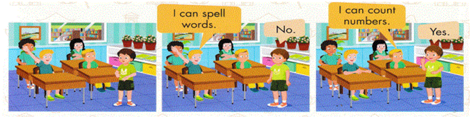 Cách chơi:  Một bạn sẽ dùng hành đông để diễn tả. Các bạn khác sẽ đoán và dùng mẫu câu “I can…”, ví dụ “I can spell words.”  (Tôi có thể đánh vần từ.), hoặc “I can count numbers” (Tôi có thể đếm số.). Nếu người chơi đoán đúng thì người diễn tả nói “Yes”, nếu sai thì nói “No”.