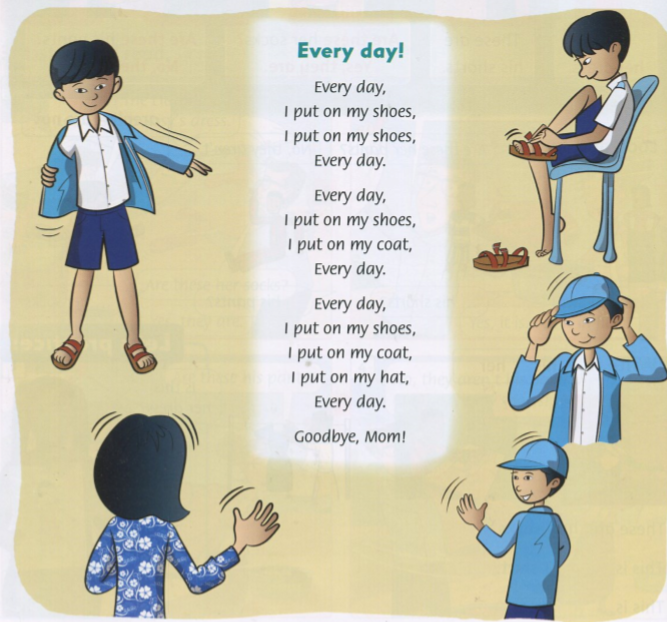 I put on my shoes, (Tôi đi giày của tôi,)