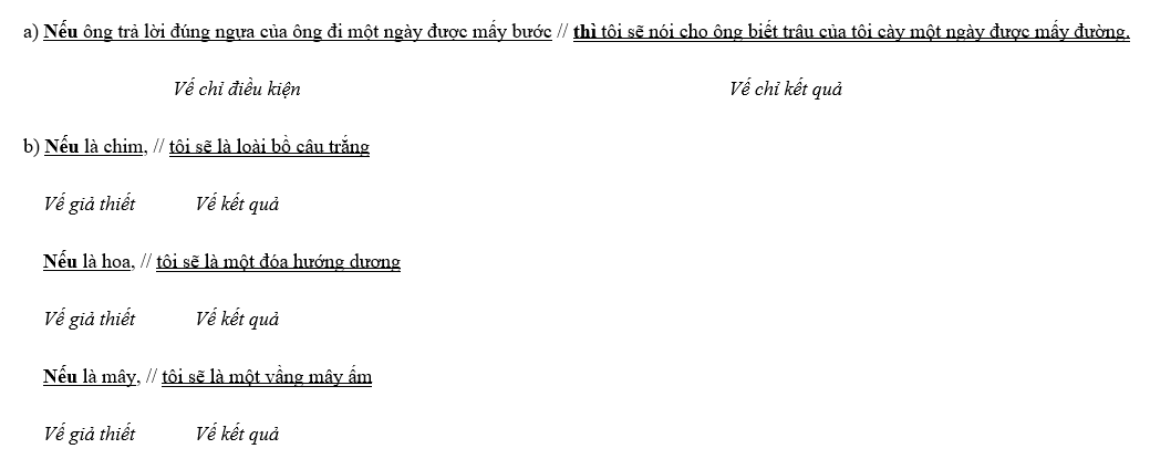 1. Tìm vế câu chỉ điều kiện (giả thiết), vế câu chỉ kết quả và các quan hệ từ nối chúng trong những ví dụ sau :