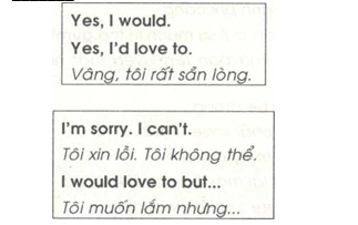 –  Để đáp lại lời mời “Would you like”, ta thường nói: