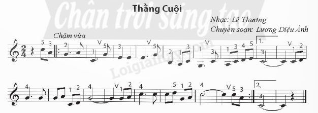 Chỉ ra các kí hiệu đã học (loại nhịp, nhịp độ, cao độ, trường độ) trong Bài thực hành số 3 – Thằng Cuội