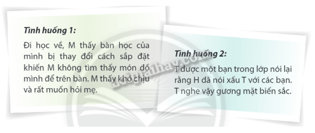 – Tình huống 1: Em sẽ hỏi mẹ về món đồ mà mình để trên bàn và chia sẻ với mẹ về cảm xúc của bản thân là em không muốn ai động vào đồ riêng tư của bản thân, mong mẹ lần sau chú ý hơn.