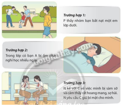 – Tình huống 1: P thấy vậy thì chạy vào can ngăn, khuyên các bạn đừng bắt nạt em nhỏ nữa. Nếu vẫn xảy ra tình ttrajng tương tự P nên báo với thầy cô, người lớn để được giải quyết.