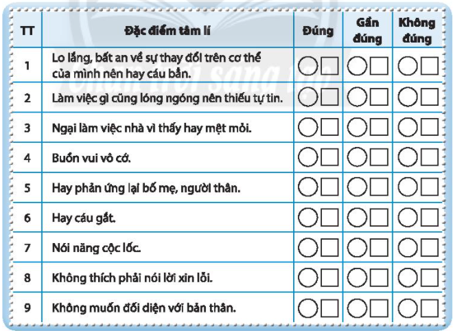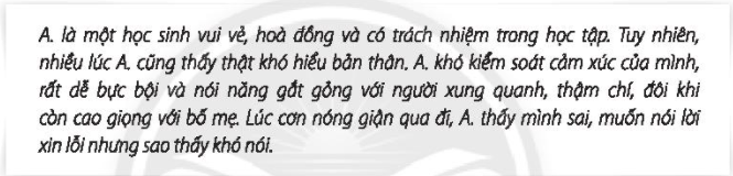 Đánh dấu X vào ô vuông nếu là đặc điểm của A. Đánh dấu X vào hình tròn nếu là đặc điểm của em. Chia sẻ kết quả của em trong việc rèn luyện những biện pháp điều chỉnh cảm xúc của bản thân.