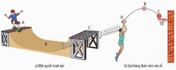 Phân tích sự chuyển hóa năng lượng trong chuyển động của người trượt ván và quả bóng rổ trong hình dưới đây.