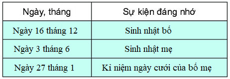Em có thể hỏi ông bà, bố mẹ hoặc anh chị về những ngày đáng nhớ của mọi người (chẳng hạn sinh nhật, kỉ niệm ngày cưới, …) rồi ghi vào bảng đã cho.