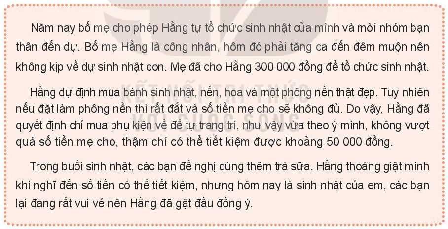– Bạn Hằng đã chi tiêu cho sinh nhật mình như thế nào? Cách chi tiêu đó có phù hợp không?