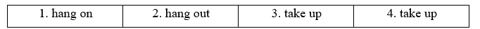 (Điền vào mỗi khoảng trống với take up, take off, hang on hoặc hang out.)