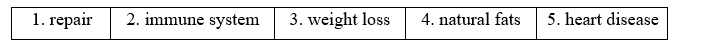 (Hãy lắng nghe một người đàn ông nói về các loại thực phẩm lành mạnh khác nhau. Hoàn thành các ghi chú với KHÔNG QUÁ HAI TỪ cho mỗi câu trả lời.)