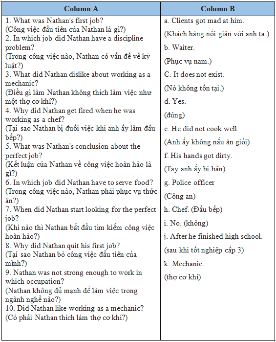 Task 3. Match the information of column B by writing the letters in the parenthesis of column A. The answers can be used one, several or no time. (Nối thông tin ở cột B bằng viết những kí tự ở cột A. Câu trả lời có thể được sử dụng một, một vài hoặc không lần nào.)