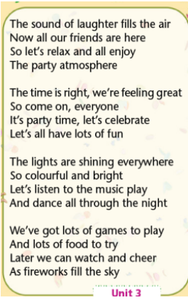 According to the song, the sound of laughter; the colourful and bright lights; lots of games, lots of food, fireworks make a good party.