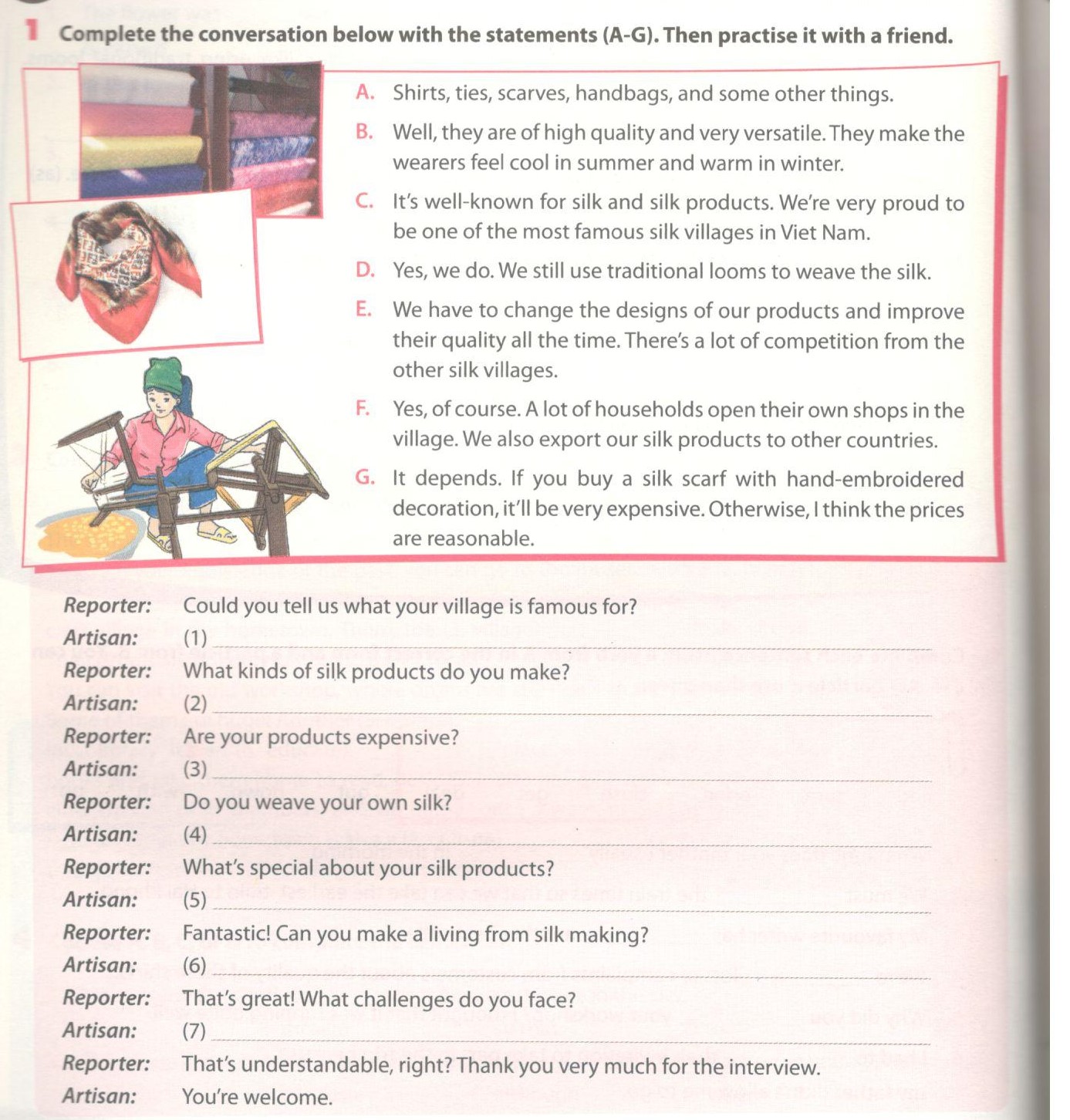 (Hoàn thành cuộc đối thoại dưới đây với những đoạn văn (A-G). Rồi thực hành với một người bạn.)