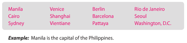 (Họp nhóm với một người bạn. Những thành phố nào dưới đây là thủ đô? Họ đang sống ở đất nước nào?)