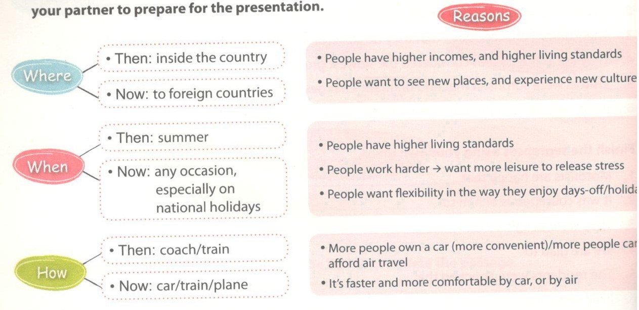 Task 2. Imagine you are going to give a presentation about the changes in the ways Vietnamese people: spend their holidays, and the reasons for those changes. Look at the suggestions, and work with your partner to prepare for the presentation.