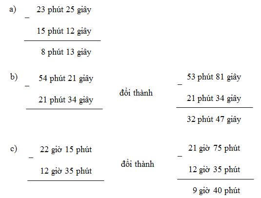 Tính: a) 23 phút 25 giây – 15 phút 12 giây; b) 54 phút 21 giây – 21 phút 34 giây; c) 22 giờ 15 phút – 12 giờ 35 phút.