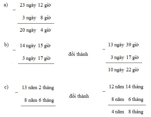 – Nếu số đo theo đơn vị nào đó ở số bị trừ bé hơn số đo tương ứng ở số trừ thì cần chuyển đổi 1 đơn vị hàng lớn hơn liền kề sang đơn vị nhỏ hơn rồi thực hiện phép trừ như bình thường.