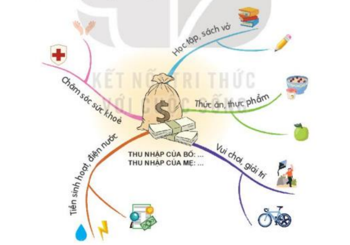 Chia sẻ công việc của người thân mang lại thu nhập cho gia đình. Thiết kế sơ đồ tư duy về chi tiêu trong gia đình.