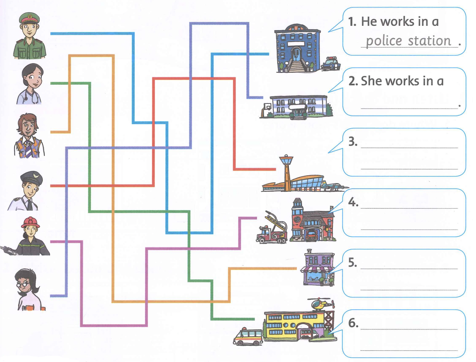 1. He works in a police station. (Anh ấy làm việc ở một sở cảnh sát.)