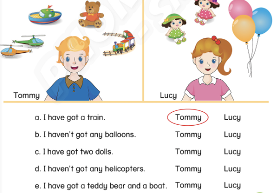 Find and circle. Read and tick or cross.Read and draw the toys Grace has got. Read and draw the toys Grace has got. Imagine you are Rita. Write the answers. Complete the questions. Answer about yourself. Listen and find the odd one out. Circle. Listen, circle and match. Put the activities into the correct column.