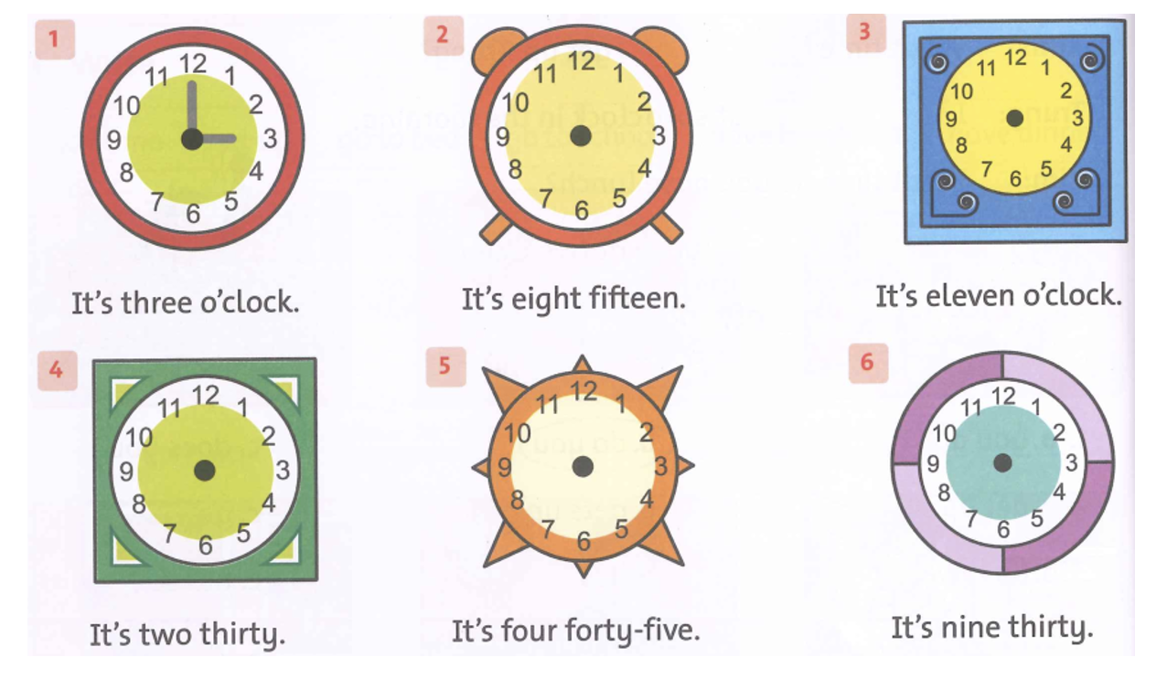 Write. Order the words. Look and write. Read and draw the times on the clocks. Listen and look at the clocks. Fill in the correct circle