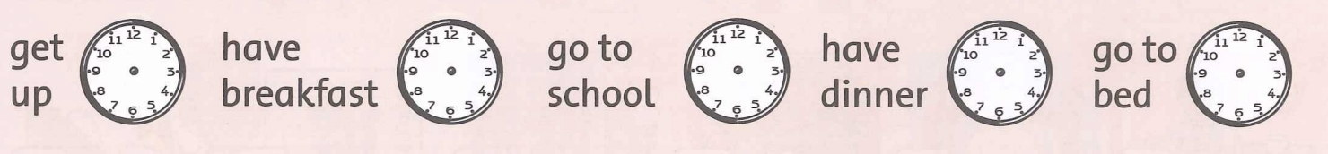 I get up at six fifteen in the morning. I have breakfast at six fifteen. I go to school at six forty- five. I have dinner at seven o’clock. I go to bed at ten o’clock.
