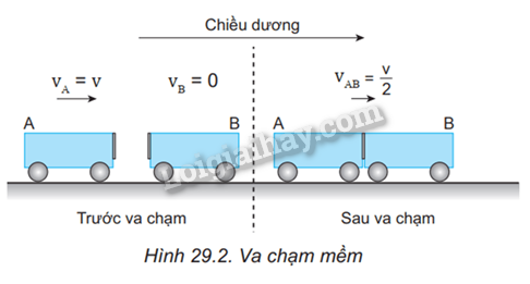 – Hai xe A và B giống nhau, đầu mỗi xe gắn miếng nhựa dính. Xe A chuyển động với vận tốc v, xe B đứng yên.