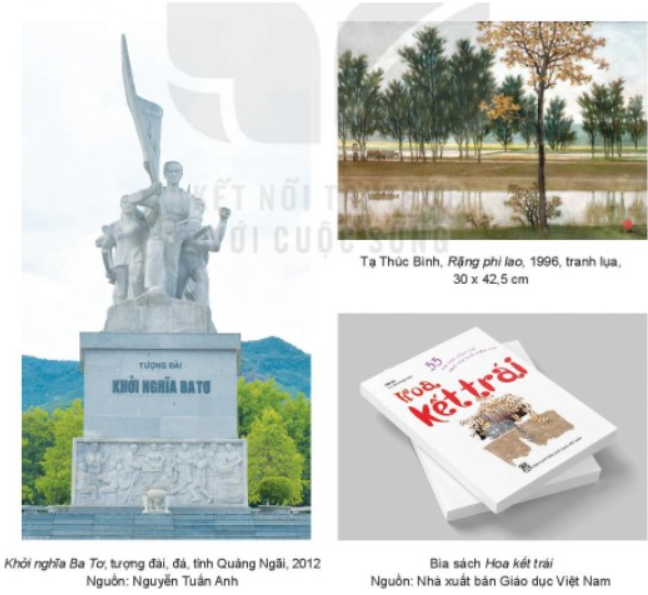 Quan sát SGK hãy trả lời các câu hỏi sau: Tượng đài Khởi nghĩa Ba Tơ thuộc thể loại mỹ thuật tạo hình nào? Tranh Rặng phi lao thuộc thể loại mỹ thuật tạo hình nào? Bìa sách thuộc thể loại mỹ thuật ứng dụng nào?