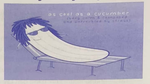 Thành ngữ trong hình có ý nghĩa “hết sức bình tĩnh khi vượt qua khó khăn” (nghĩa gốc là: lạnh lùng như quả dưa chuột). Vì thế câu thành ngữ minh họa bằng hình ảnh quả dưa chuột hết sức “lạnh lùng”.