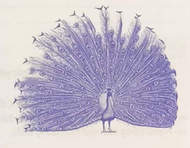 Đuôi chú chim công đực có màu ánh đồng sang trọng. Mỗi sáng, chú ta lại đi ra khỏi tổ, quét chiếc đuôi dài của mình trên sân và làm động tác kiểu ngạo là khoe ra bộ lông đuôi sặc sỡ của mình. Khi xòe ra, chiếc đuôi trong như một chiếc quạt nan khổng lồ đính những vòng tròn đồng tiền như những viên ngọc bích với những lớp màu xanh lam, đỏ đồng, vàng và nâu nối tiếp nhau theo hình những tròn đồng tâm. Các màu sắc trên lông đuôi hòa vào nhau, tạo nên một bức chỉnh thể đẹp tựa tranh của một họa sĩ kì công tạo nên tác phẩm cho cuộc đời.