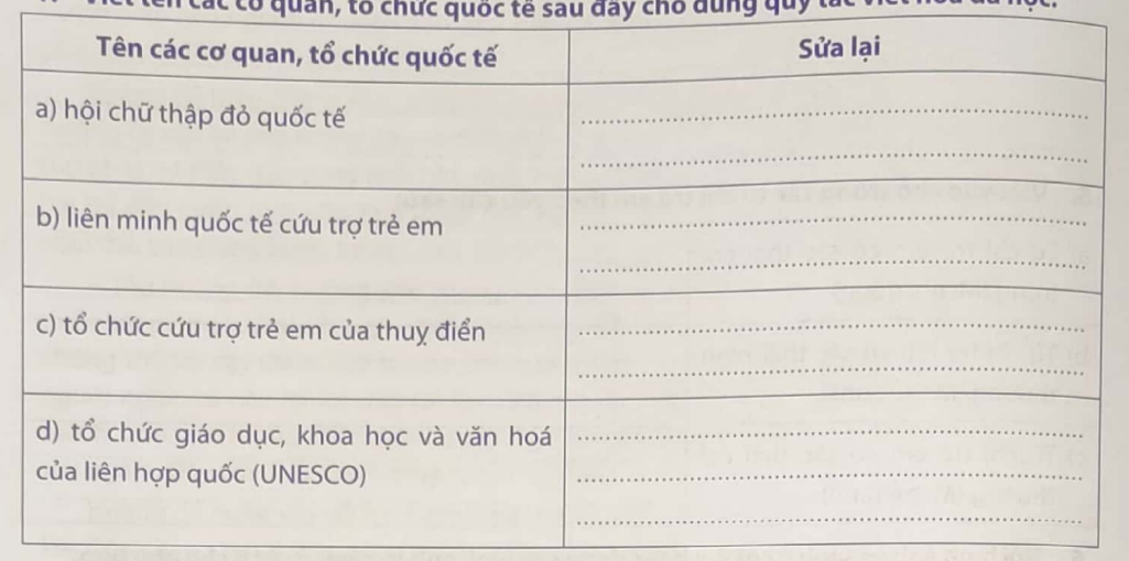 Viết tên các cơ quan, tổ chức quốc tế sau đây cho đúng quy tắc viết hoa đã học. Viết một đoạn văn tả một nghệ sĩ mà em biết hoặc một người mà em yêu mến.