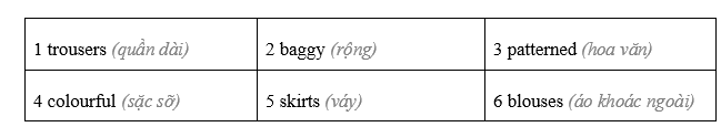 “Jeans will always be popular”, she says, “but the very thin, tight styles of today’s “skinny jeans” are very different from what people used to wear. In the 1970s, for example, everyone had big, 2 b…………… flared jeans. They were sometimes plain, but usually 3 p……………. and 4 c……………., with big, bright flowers. Girls used to have very long dresses and 5 s…………….., often down to their feet. And on top, they used to wear pretty, feminine 6 b…………… Long-sleeved shorts and tops were more popular than short-sleeved ones.”