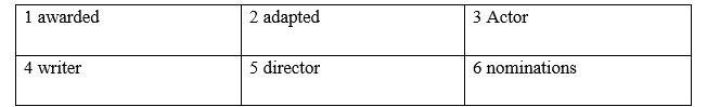 3 ……………. Suraj Sharma, the 4 …………… of the film, was almost unknown; the role of Pi Patel was his first major film project. Film 5 …………. Ang Lee made a beautiful, funny and sad film which looks incredible in 3D. It got seven Oscar 6 ………………., and won four of the awards, making it Lee’s most successful film.