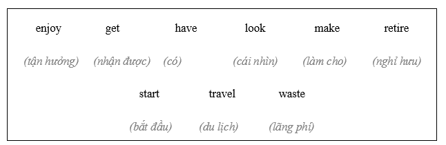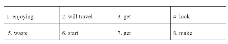 After my travels, I’ll start my degree. People like to 4 ………….. after themselves these days, and I’m planning to study personal fitness. After university, doubt that I’ll 5 ………… time working for someone else for long. I’m hoping to 6 ………….. up my own business when I’m around thirty, and by the time I’m forty-five, I want to 7 …………. my first million pounds! Then I can 8 …………….. young, and really enjoy life!