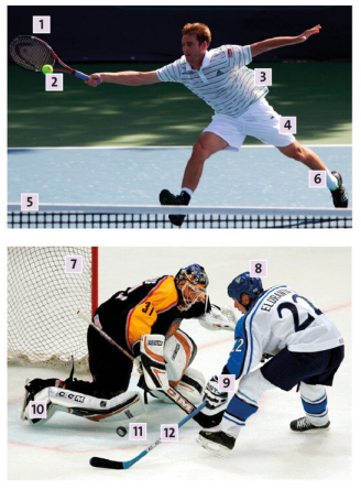 Equipment: ball (bóng); bat (gậy đánh bóng); goal (khung thành); hoop (rổ bóng rổ); net (lưới); puck (bóng khúc côn cầu); racket (vợt); rope (dây thừng); safety harness (dây đai an toàn); skates (giày trượt); stick (gậy); surfboard (ván lướt)