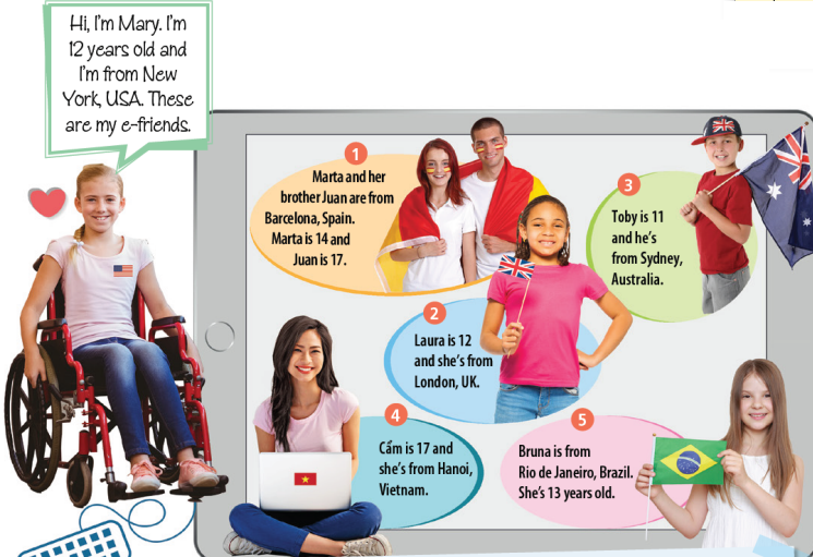 (Xin chào, tôi là Mary. Tôi 12 tuổi và tôi đến từ New York, Mỹ. Đây là những người bạn qua mạng của tôi).