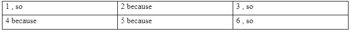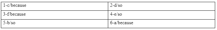 (Nối các dòng từ 1-6 với các dòng từ a-f. Sau đó viết thành các câu mới sử dụng so và because.)