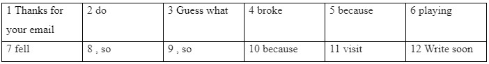 1Thanks for your email  How’s it going? Are you going to 2do anything interesting this week? Guess what   ? I had some really bad luck! I broke my ankle! I’m not happy because it’s only the first week of the holidays! It happened on Tuesday when I was 6 playing football in the garden with Dan and Riley. The grass was very wet and I 7fell over. My ankle really hurt 8, so my mum took me to hospital. We waited for two hours because it was very busy. The doctor said it was a bad injury 9, so. I had an operation. At the moment, I’m lying in bed 10 because I can’t walk on my ankle. Please come and 11visit me!