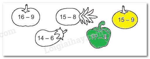 Ta tô màu xanh vào quả ghi phép trừ 17 – 8 và tô màu vàng vào quả ghi phép trừ 15 – 9.