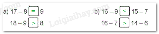 Tính nhẩm kết quả các phép trừ, so sánh 2 vế rồi điền dấu thích hợp vào ô trống.
