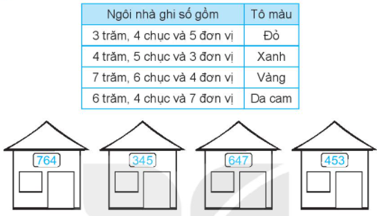 Xác định số trăm, số chục, số đơn vị của các số trên mỗi ngôi nhà rồi tô màu theo yêu cầu của bài toán.