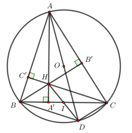Cho tam giác ABC có ba góc nhọn nội tiếp đường tròn tâm O. Các đường cao AA’, BB’, CC’ của tam giác ABC cắt nhau tại H. Đường thẳng AO cắt đường tròn tâm O tại D khác A.