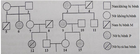 Bệnh P do một trong hai alen của một gen quy định; bệnh M do một trong hai alen của một gen nằm ở vùng không tương đồng trên nhiễm sắc thể giới tínhXquy định.Biết rằng không xảy ra đột biến. Theo lí thuyết có bao nhiêu phát biểu sau đây đúng?