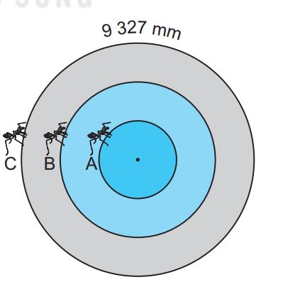 Có ba con kiến A, B, C bò trên ba vòng tròn. Kiến C bò một vòng được 9 327 mm, dài gấp 3 lần một vòng của kiến A.