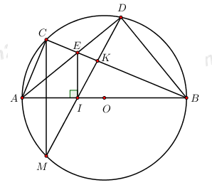 Câu 4. Cho đường tròn \(\left( O \right)\) đường kính AB và điểm C trên đường tròn \(\left( {C \ne A;C \ne B} \right)\). Gọi D là một điểm trên cung nhỏ \(CB\,\,\left( {D \ne C;D \ne B} \right)\) ; E là giao điểm của AD và BC; I là hình chiếu vuông góc của E trên AB; M là điểm thứ hai của đường thẳng DI và đường tròn \(\left( O \right)\).
