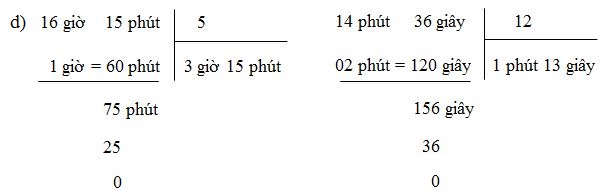 d) \(16\) giờ \(15\) phút \(: 5\);                \(14\) phút \(36\) giây \(: 12\).