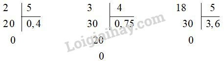 Vậy: \(\dfrac{2}{5}= 0 ,4\) ;         \(\dfrac{3}{4} = 0,75\);          \(\dfrac{18}{5} = 3,6\).